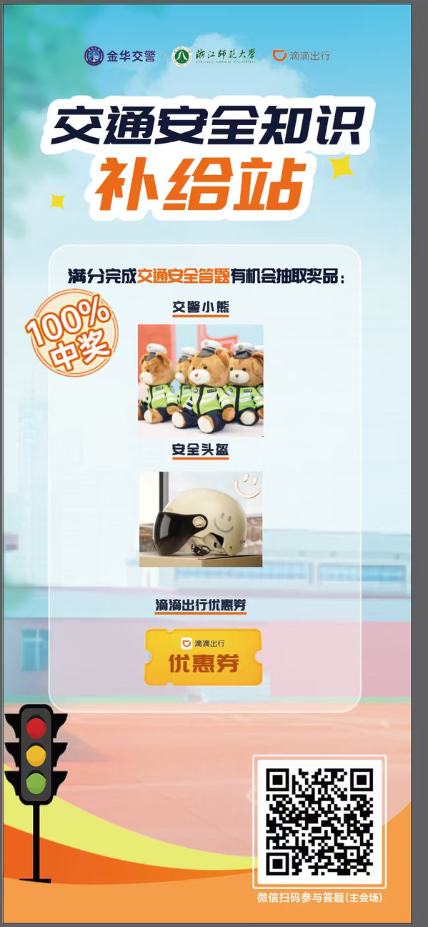 9 月 26 日上午,浙江师范大学联合金华市公安局交通管理支队、滴滴出行,在北田径场举办阳光下的守护交通安全体验课宣传活动。活动通过沉浸式场景演绎、趣味互动游戏与知识补给答题三大板块,将交通安全知识转化为直观可感的体验,为同学普及出行安全要点,进一步筑牢校园交通防护网。